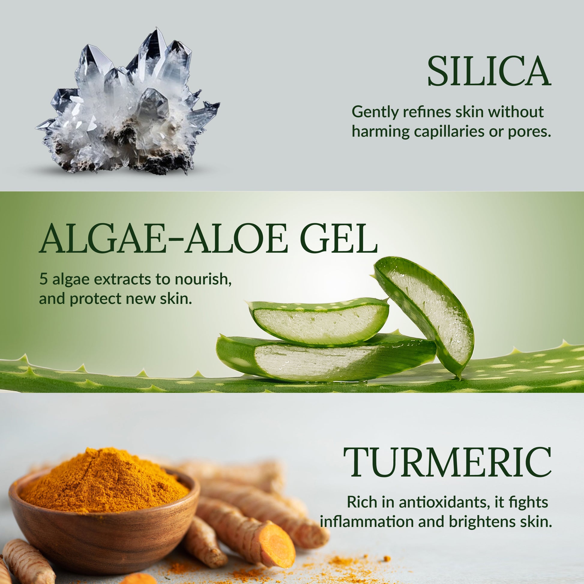 - What are the main ingredients?- Silica: Ultra-fine silica crystals that gently exfoliate, purify, and refine the skin without damaging capillaries and pores.β - Algae-Aloe Gel: A powerful, antioxidant-rich combination of five algae extracts with aloe vera to soothe, nourish, and protect new skin. - Turmeric: Rich in antioxidants, renowned for its ability to fight inflammation, and brighten and purify the skin.β